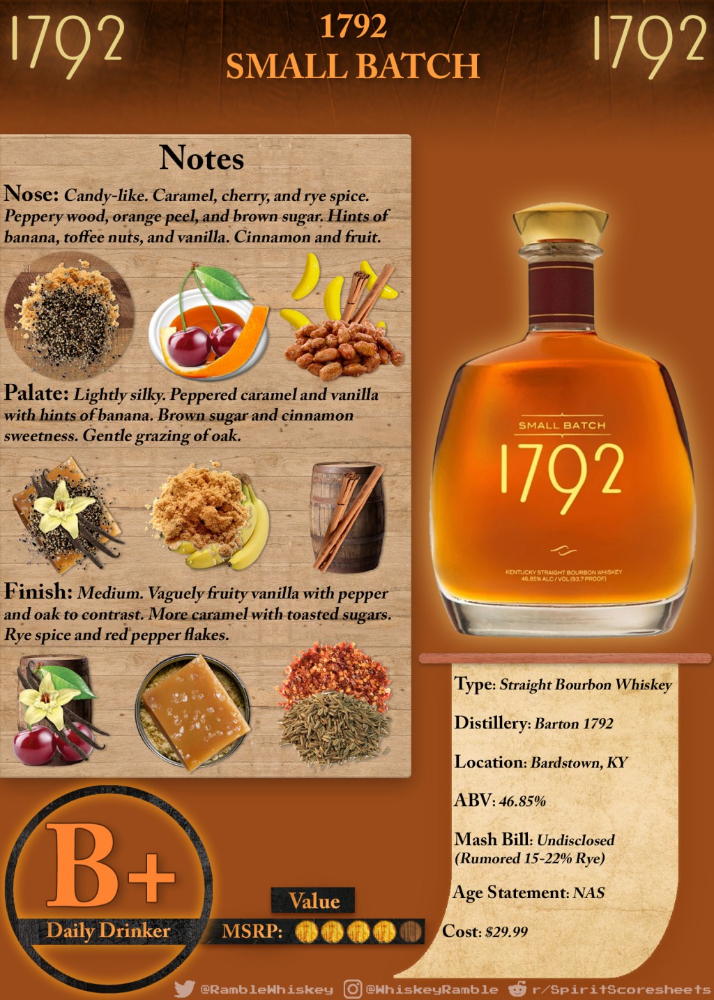 Then there’s the key in-house brand, 1792. While expressions like the Sweet Wheat, 12-Year, and Port Finish are often subject to allocation, the entry-level Small Batch is easy to find and often affordable. One of the more curious aspects about the Small Batch is the word choice used on the bottle, claiming it’s “incomparably brash and bold, yet smooth and balanced.” Can’t say I’d think to use those words together to describe a bourbon, but let’s see if the drinking experience proves to be enlightening.