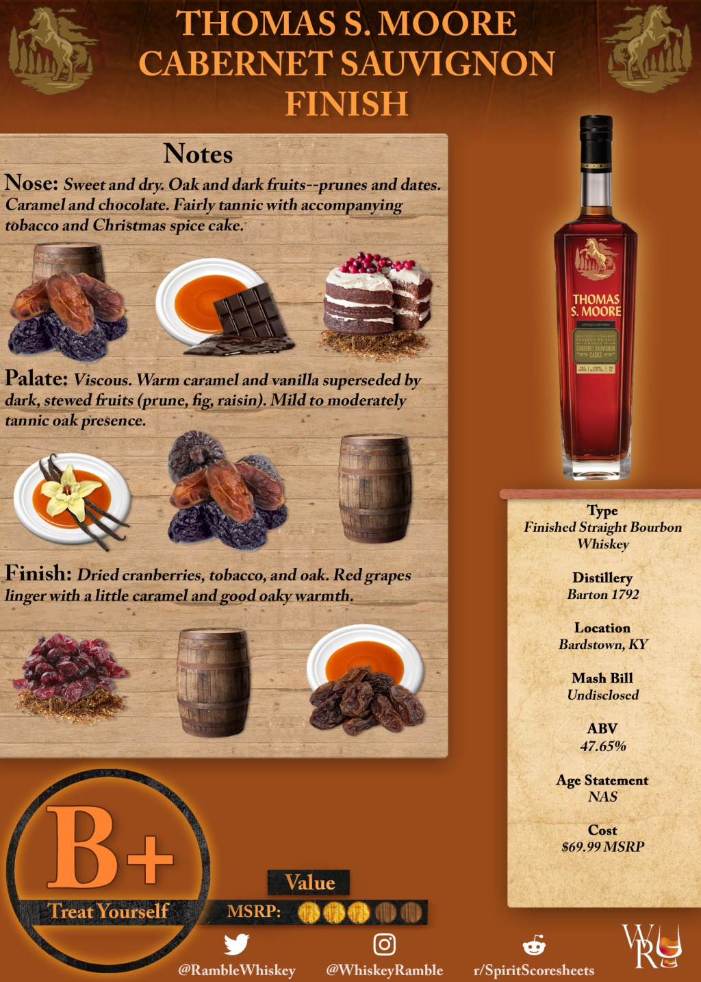 Barton 1792 gets around more than one might think. On top of the in-house 1792 line, their whiskey is used for the likes of Very Old Barton, Sam Houston, Calumet Farm, Goodwood, and perhaps most recently, Thomas S. Moore. The name is taken from a pioneer who, in 1889, built the distillery that ultimately became Barton 1792. The gimmick with this bourbon line is that each bottling is finished, with the initial launch bringing three expressions: Port, Chardonnay, and Cabernet Sauvignon. We’ll be looking at the latter today.