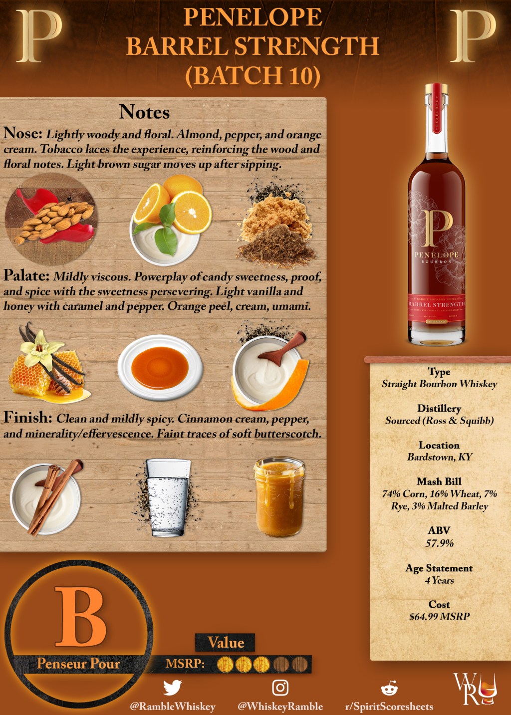 Between my first impression with Penelope bourbon and the trend I’ve seen with batch reviews as they continue to release, I’d say they’re on the right path. As Michael and company come into older stocks, they’ll only further improve their blending and batching prowess. The overall composition is executed to a satisfying degree with just enough curiosity to help it stand out. If you want a fun, high-proof indication of what a four-grain bourbon is like, then Penelope Bourbon Barrel Strength is solid option.