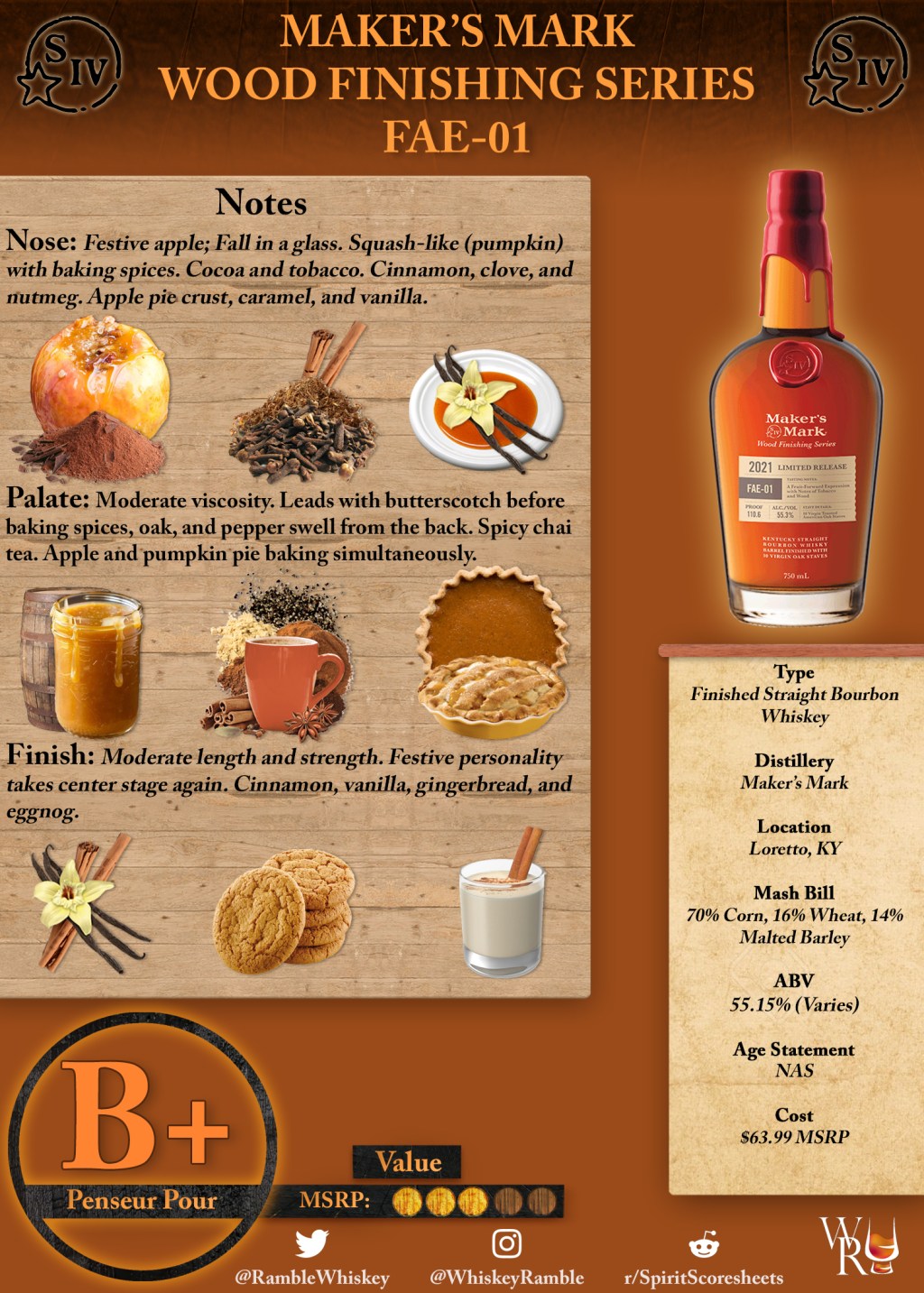 The main thing I’ll say about FAE-01, if my notes don’t paint the picture already, is that it’s by far the most festive whiskey I’ve tried. Every pour reminds me of the holidays (in a good way), particularly enjoying a little chai tea and gingerbread while two obligatory pies bake in the oven. That experience is an appropriate complement to Maker’s core profile, resulting in a dram that feels well and properly harmonized. They might advertise notes of fruit and tobacco for the flavor profile, but I think a spice cabinet during the holidays is more appropriate.