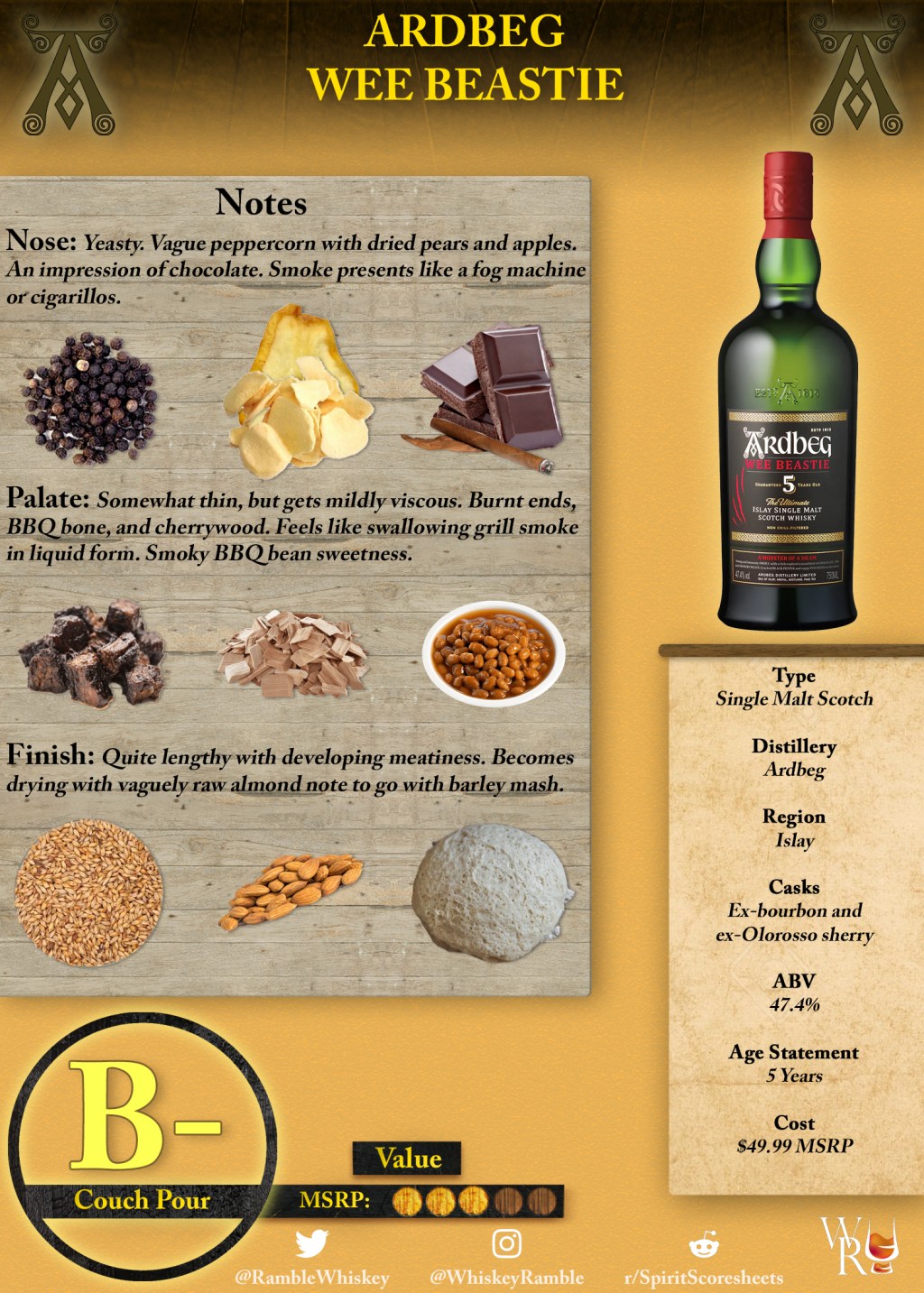 This brings us to the subject of today’s review. Ardbeg Wee Beastie is the brand’s latest core expression, aiming to be “the rawest, smokiest Ardbeg ever.” To that end, the bottle only carries a 5-year age statement, since further aging effectively reduces the presence of peat from the new make in favor of cask-influenced flavors. So while Wee Beastie does spend time in both ex-bourbon and Olorosso sherry casks, it may be safe to assume they were used a couple or so times before being filled with the distillate intended for Wee Beastie. Other statistics include being non-chill filtered (like other Ardbegs), bottled at 47.4% ABV, and carrying an MSRP of around $50.