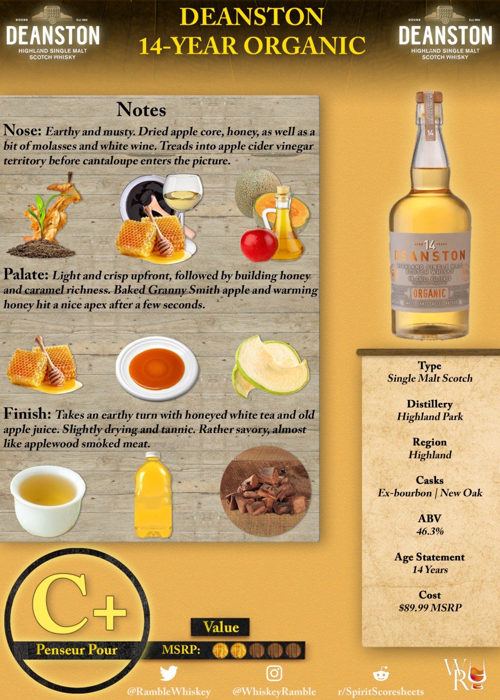 I recently purchased one of these organic bottlings, a 14-year product described as a limited annual release. Although the box seems to indicate that the whisky was exclusively aged in new oak casks (“this precious spirit was carefully hand-filled to new oak barrels and left to sleep, undisturbed, for 14 years”), online sources indicate that it was first matured in ex-bourbon casks followed by a finishing period in new oak casks. Based on a comparison between this and Deanston’s Virgin Oak bottling from Whiskey Riffs, I’m inclined to believe the latter since both are said to be naturally colored and the NAS Virgin Oak is much darker.