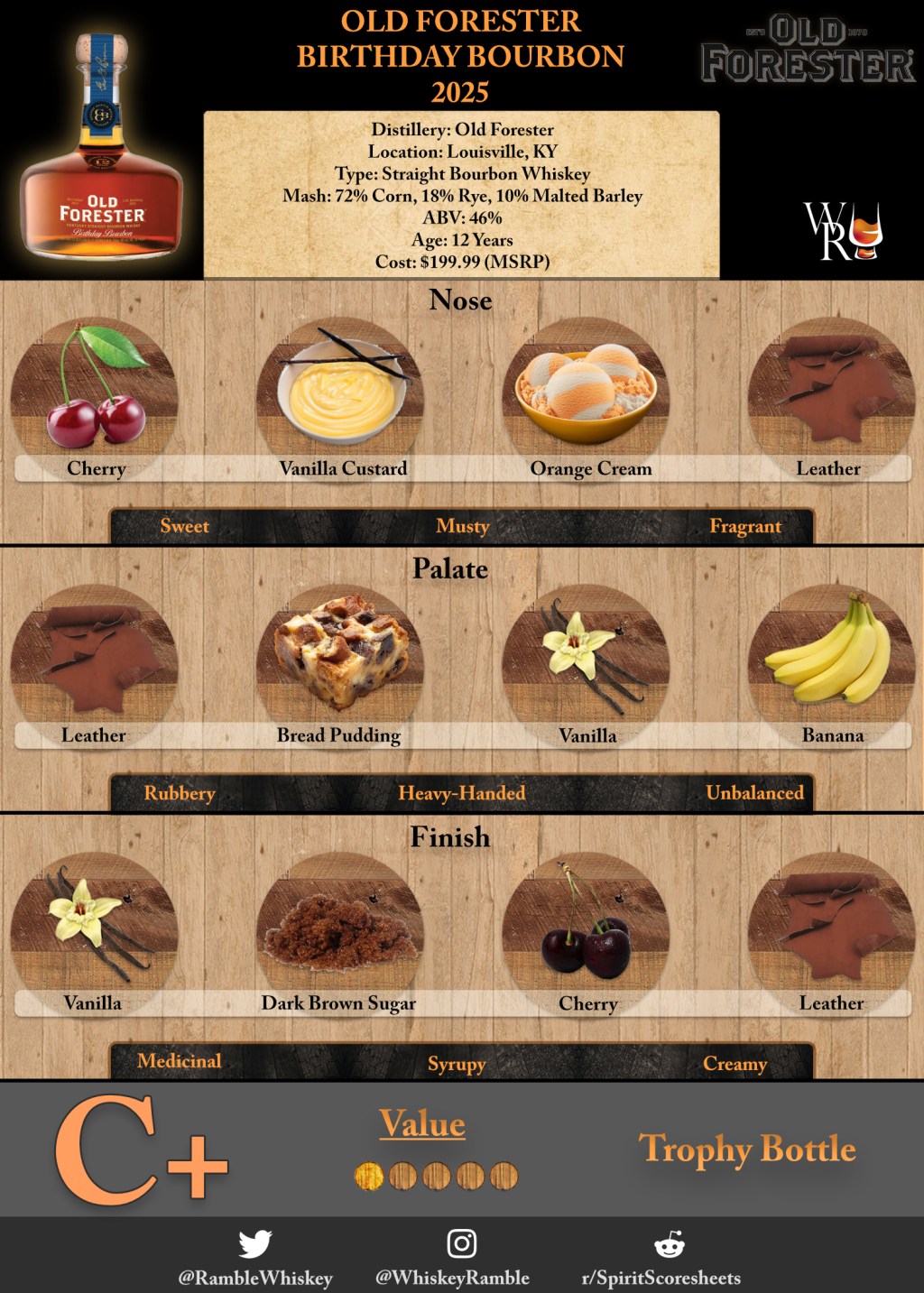 Unfortunately, the 2025 Birthday Bourbon is an overall unremarkable pour that brings a sloppy drinking experience to the table. While the nose and very end of the finish are positive, everything in-between treads into unpleasant territory. There’s such an emphasis on vanilla, which I normally love, but it comes with heavy leather and medicinal cherry notes. Based on The Bourbon Culture’s breakdown of Brown-Forman’s warehouses, this checks out, since warehouse K is apparently known for its antique oak notes, with some folks getting cherry as the dominant fruit note. In fact, when you break down the experience, this isn’t completely unlike what I get from Weller 12-Year, albeit with more richness.